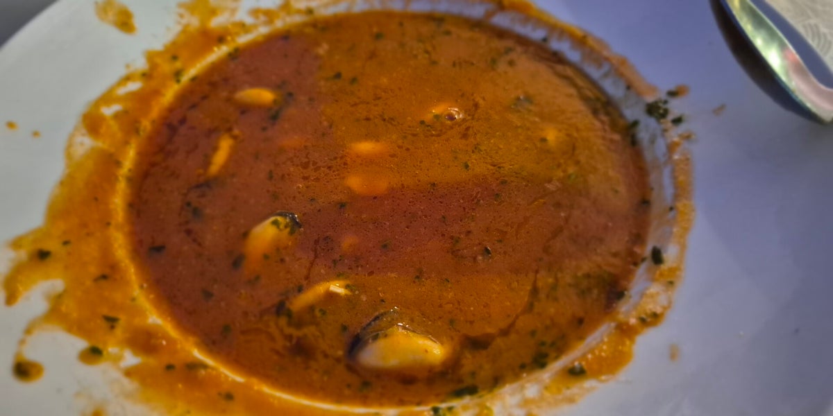 Toen mijn Zuppata arriveerde had ik al meteen "spijt" van mijn dubbele bestelling. De portie was grotesk, maar vooral overheerlijk. Ze konden dan wel net niet tippen aan de Goudmerkmosselen van De Gouden Tak, maar nondeju, 't kwam aardig in de buurt! Ik besloot eerst de mosselen uit de schelp te halen om daarna de soep lekker op te lepelen! Na enige tijd merkte ik dat er nog één minimosseltje met schelp in de soep dreef. Toen ik deze van zijn harde jasje wilde ontdoen, ontstond er een spretsjpartij van jewelste. Tafel vol, T-shirt vol, maar ik genoot gewoon verder!