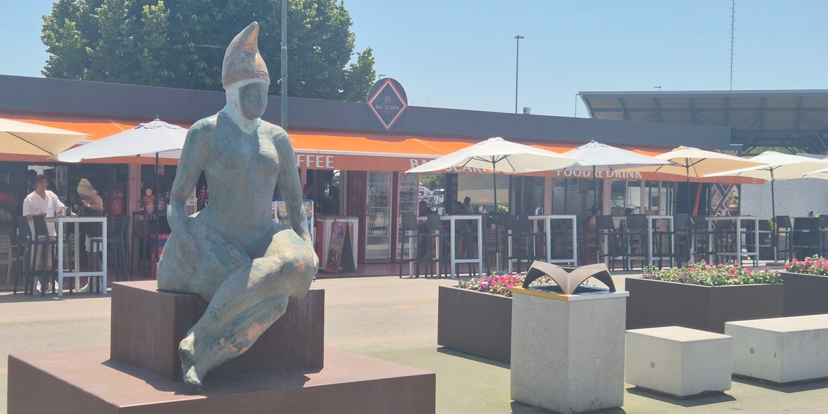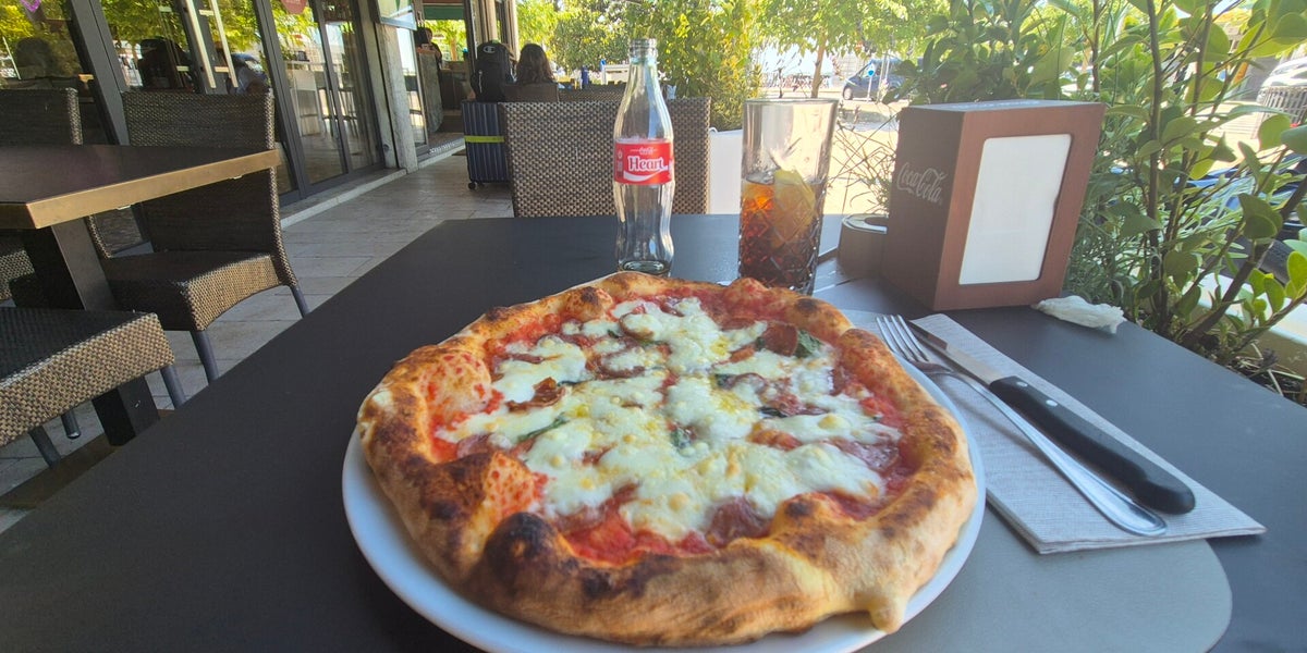 Ik besluit om even te lunchen, het is toch al half één ondertussen, en zet pas vaart naar Punta Sabbione na een Pizza Diavolo en een frisse cola. Terwijl ik mijn lunch nuttig, vraag ik aan AI wat ik had moeten doen mochten er geen overzetbootjes zijn. Het resultaat staat tussen de foto's.