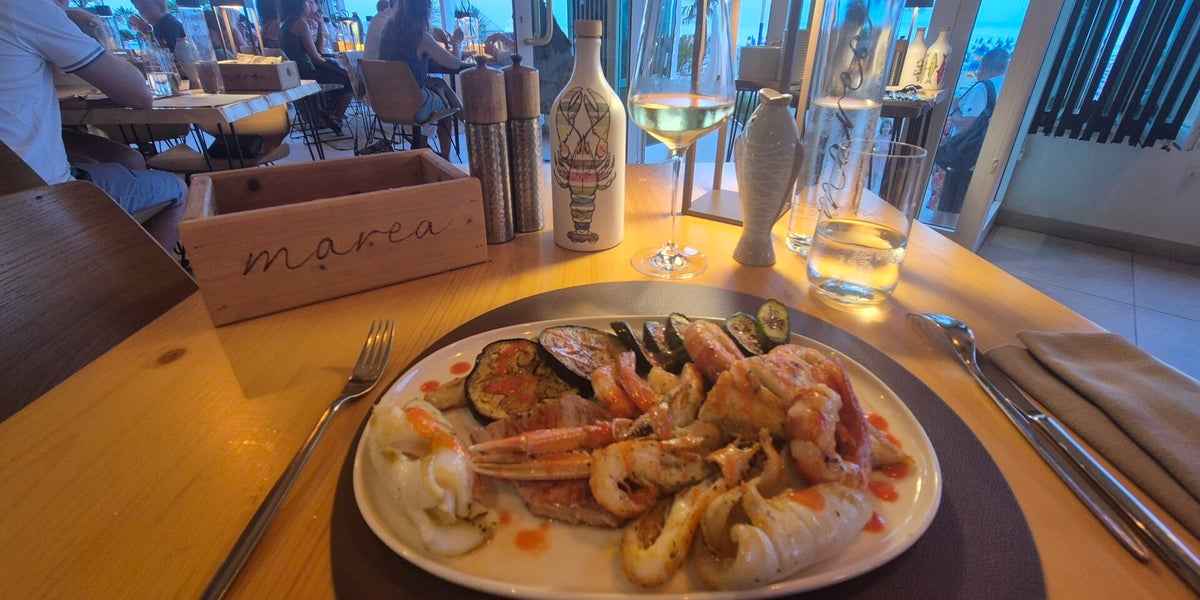 Ik neem Grigliata mista di Pesce: filetto di Branzino, crancio di tonno, calamaro, gamberoni, scampi & zucchine a la griglia! Een hele mond vol en dat is het ook. Geen pasta, puree, frietjes of rijst dabei. Enkel wat brood en heerlijke crackers.