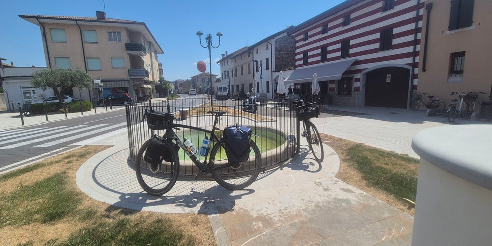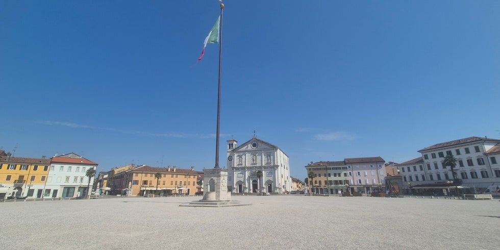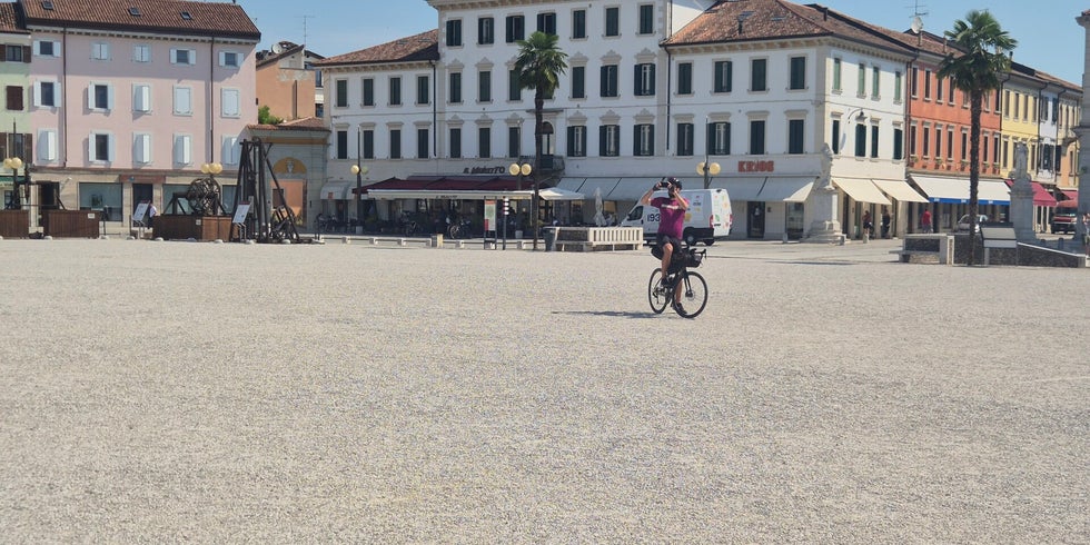 Na het petit déjeuner en het klaarmaken van de fietsen, nemen we nog een obligate foto op het prachtige centrale piazza van Palmanova en weg zijn we!