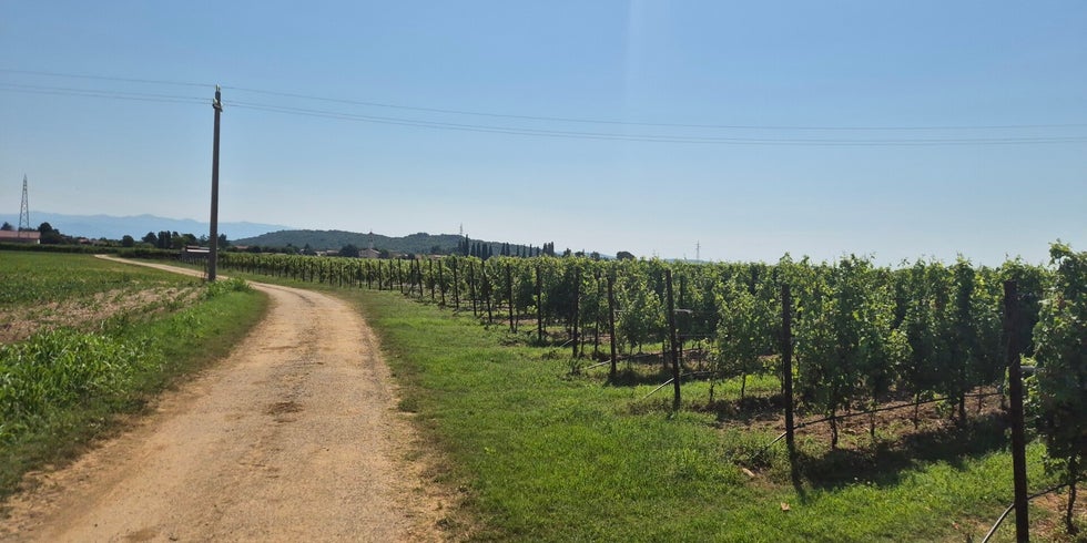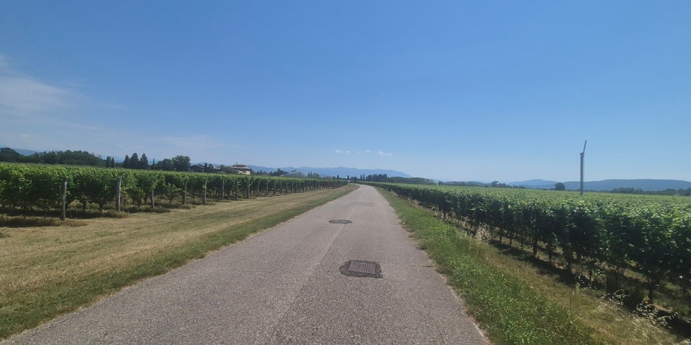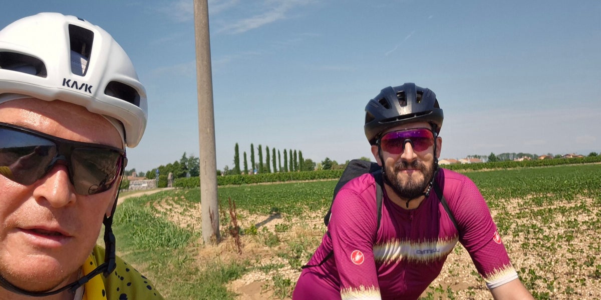 Vlak voor het laatste euvel van de dag, een ongeveer 3 km lange strada biancha die aan ongeveer 2% omhoog loopt, tanken we de bidons vol met, ik bedoel in, Prosecco. Wat Prosecco met Prosecco te maken heeft, weet ik eigenlijk niet en ik ben te moe en te weinig geïnteresseerd om het op te zoeken. Prosecco stelt precies ook maar weinig voor. Ik stel Mihai, ene Crémant van ene kerel trouwens, voor om meteen door te rijden. "Cava", sekt hij en we zetten onze Champagnerit verder!