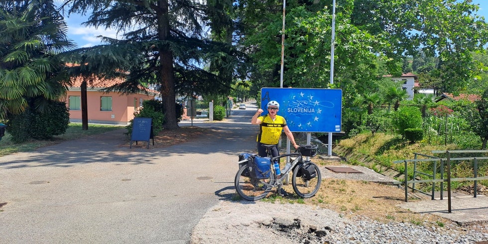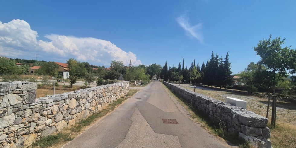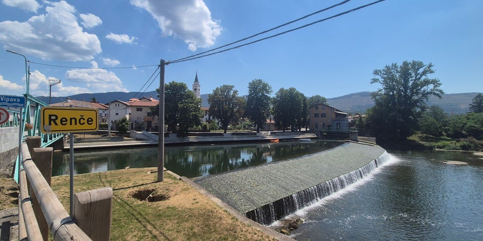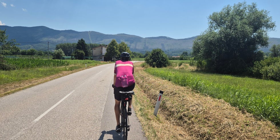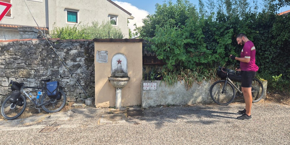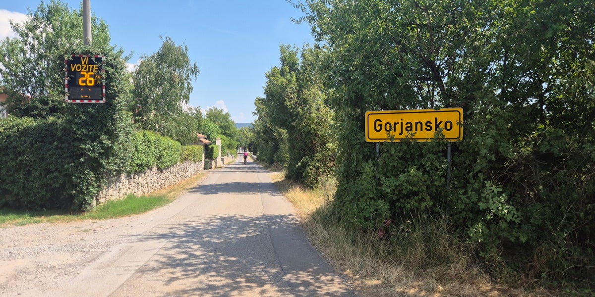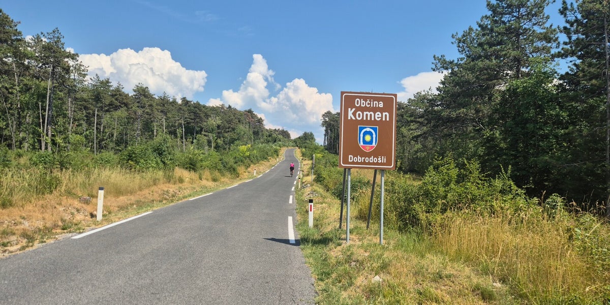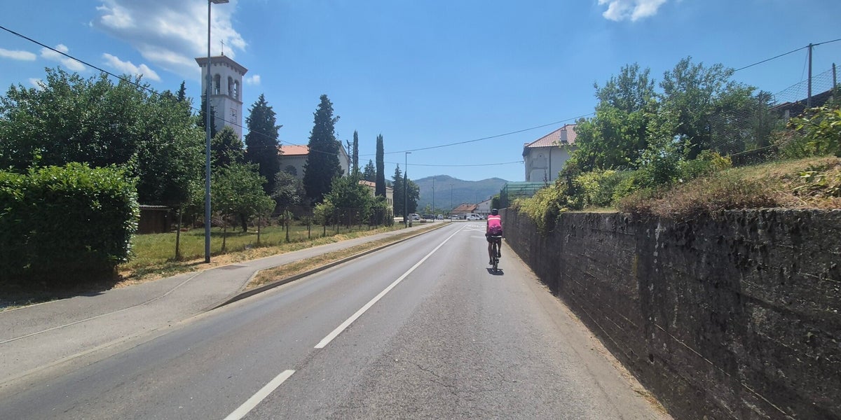 Daarna rijden we een tijdje in Slovenië door stadjes of dorpjes met de klinkende Bukovica en Renče. Hier begint dadelijk de pittigste klim van de dag, maar net voor we eraan beginnen, vinden we een supermarktje waar we frisdrank en ijskoud water kopen. Over de frisdrank toch even reclame maken: Schweppes Tangerine is gigantisch lekker!