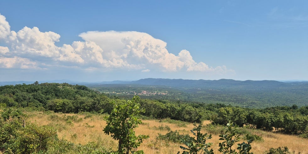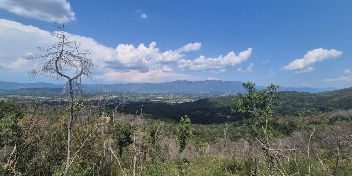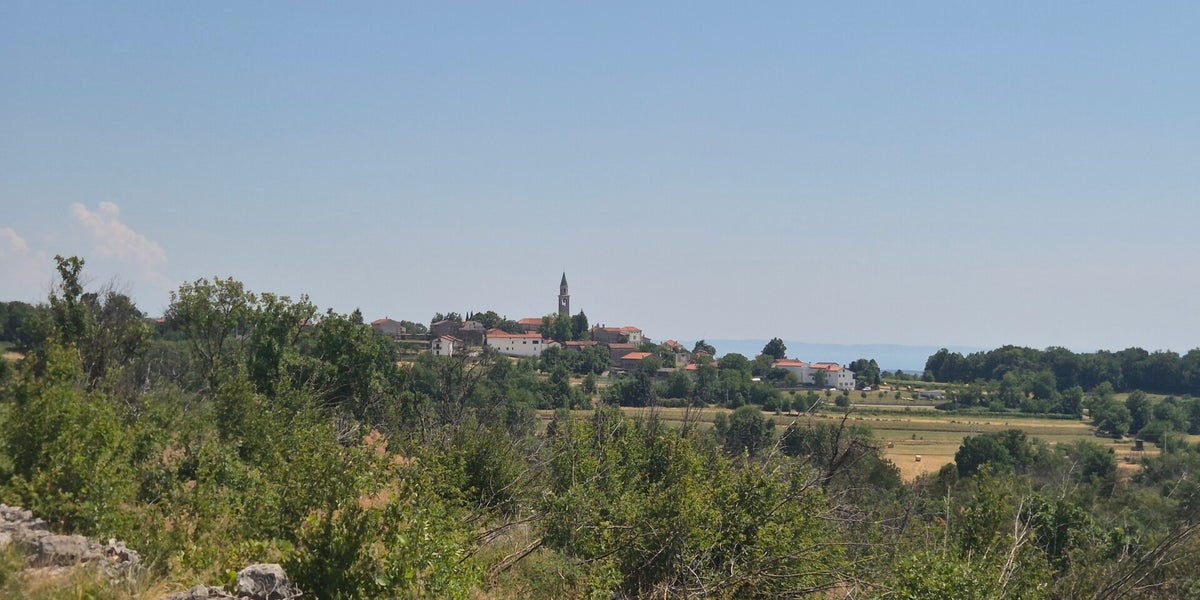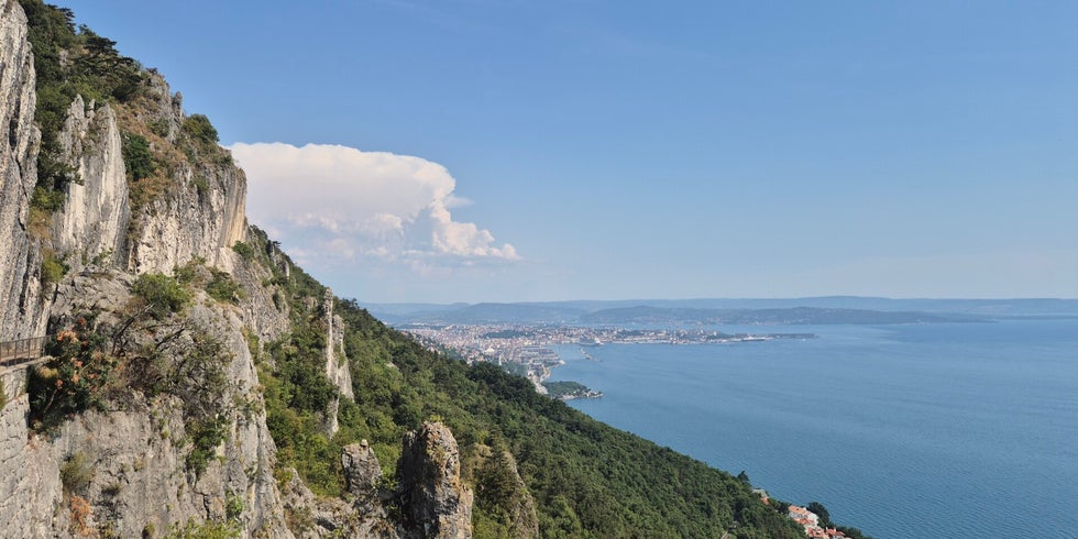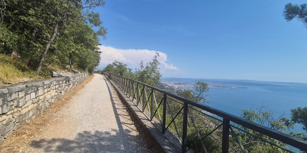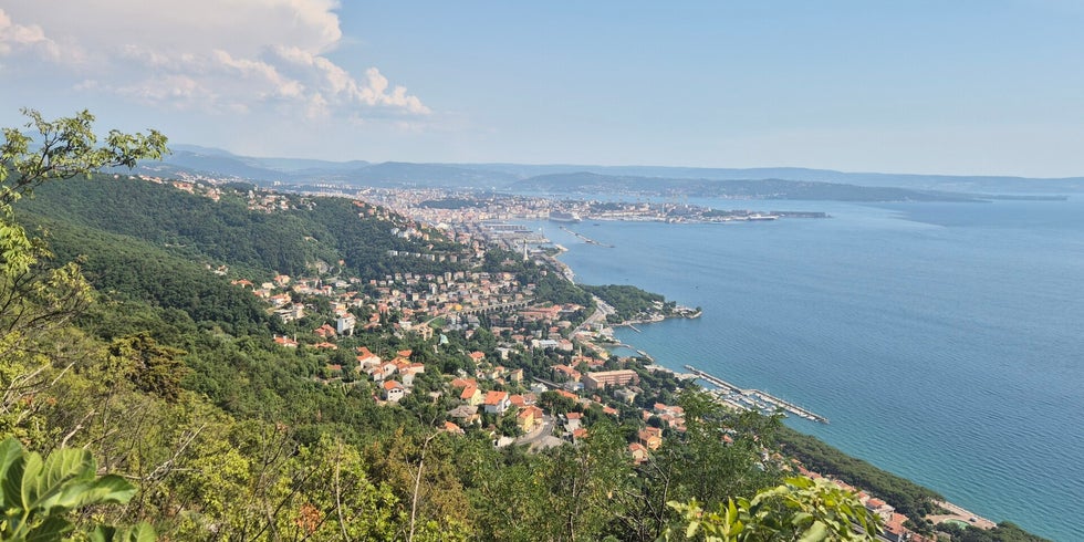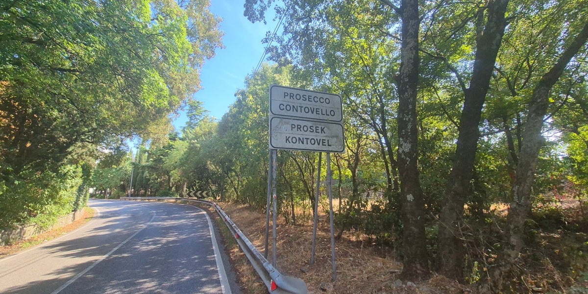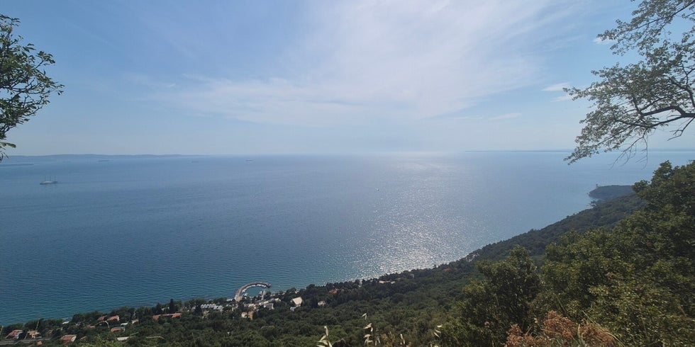 Net voor we aan bovenvermoende strada biancha beginnen, krijgen we een adembenemd uitzicht voorgeschoteld: een subliem vergezicht op de Adriatische Zee met in de verte Trieste. We zitten zowat op 250m boven de zeespiegel. Het is een lust voor de ogen!