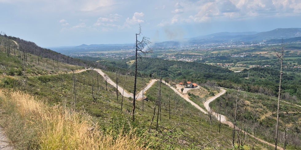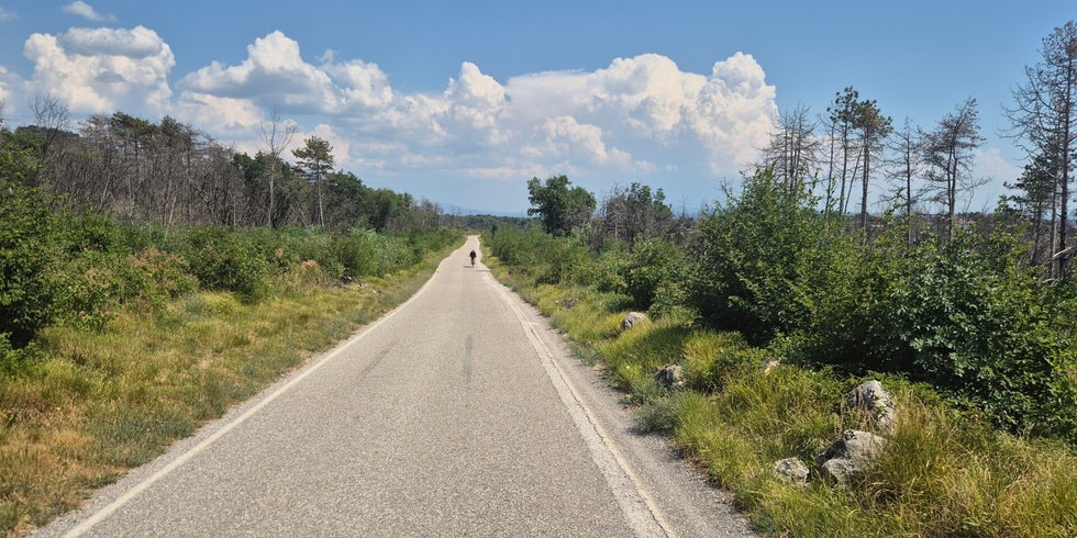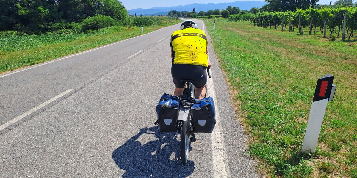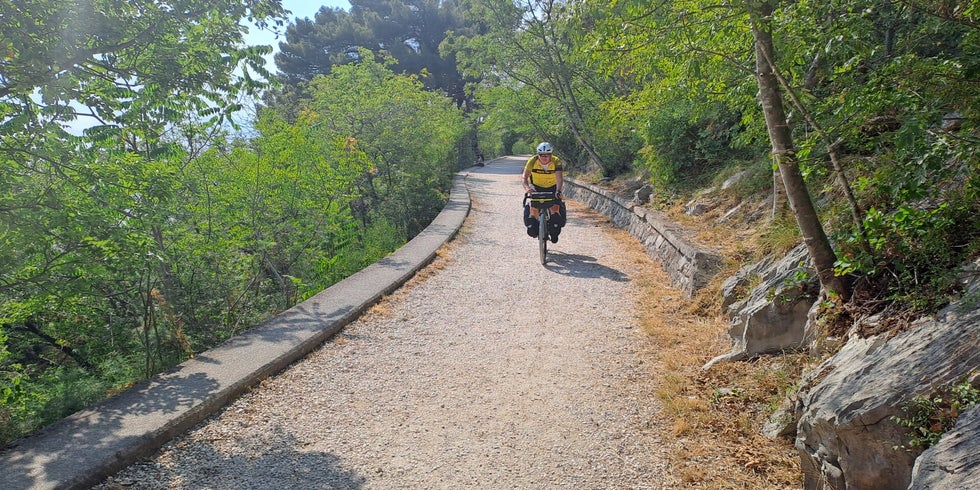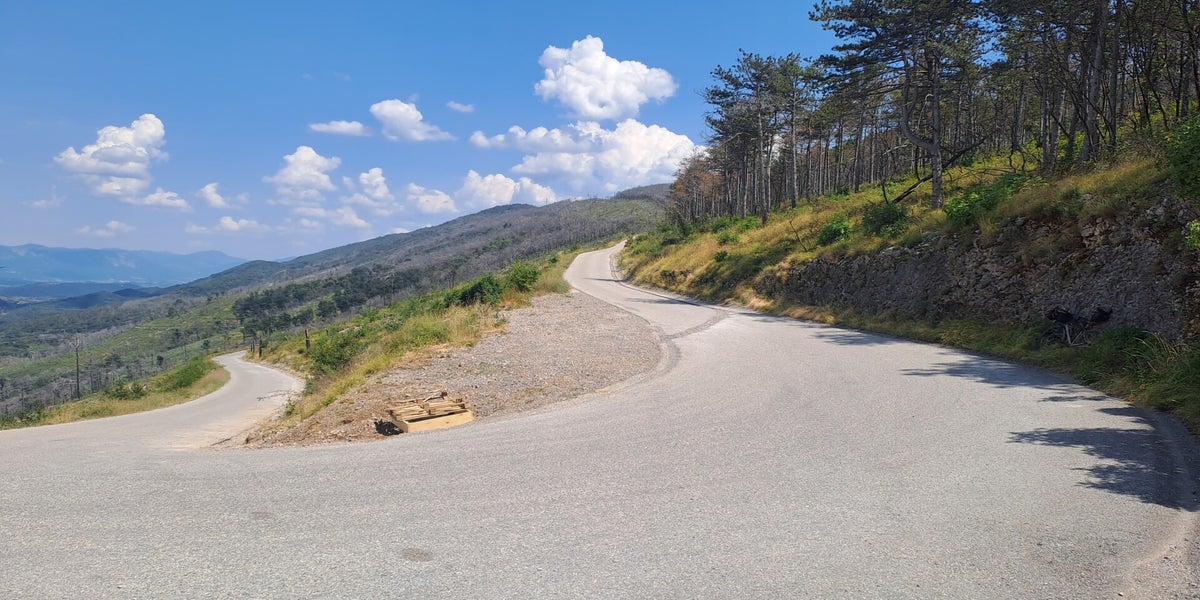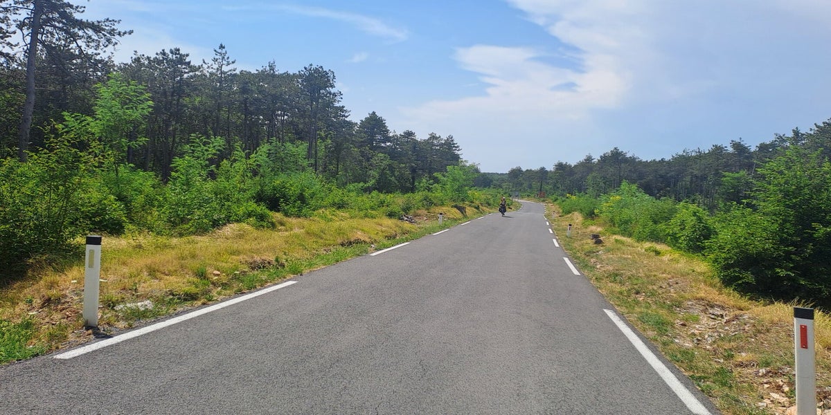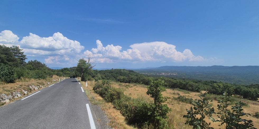 Bovenaan de klim weet je dat het ergste van de dag voorbij is en rijden we, over heerlijk asfalt, golvend naar Trieste. Een mooie beloning!
