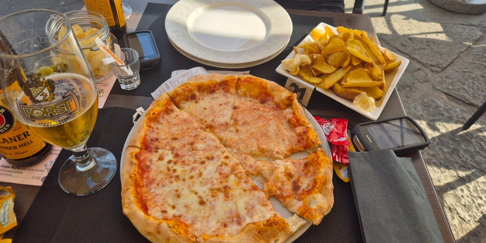 We versieren een plekje op een terras langs het kanaal waarin Mihai's fiets bijna valt. Dat zou nog wat geweest zijn! Twee Paulaners, een Margarita en een portie frieten hebben we dubbel en dik verdiend!
