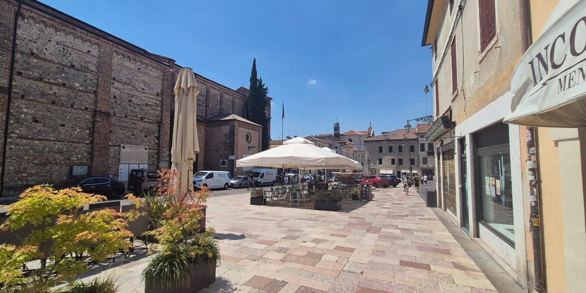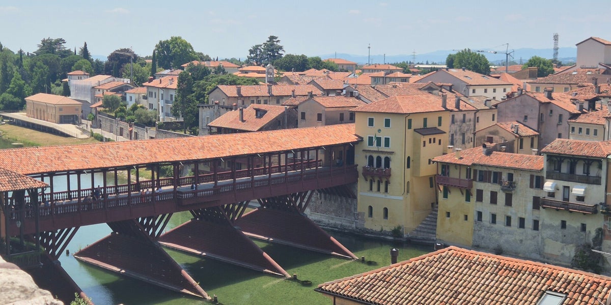 Tegen het middaguur besluit ik dat ik toch maar iets moet eten. De eerste tent die ik tegenkom, waarop in grote letters BEER & FOOD geschreven staat, serveert enkel koffiekoeken en slappe broodjes. Daar heb ik geen zin in. Enkele kilometers verder kom ik dan door Bassano del Grappa, jaja dat van de drank! Prachtig stadje dat volop bruist! Er is dan ook een oldtimertreffen aan de gang, wellicht dezelfde vwatuurs die ik gisteren al tegenkwam toen ik Alleghe (het dorp aan het meer en het meer aan het dorp, weet je nog) verliet.